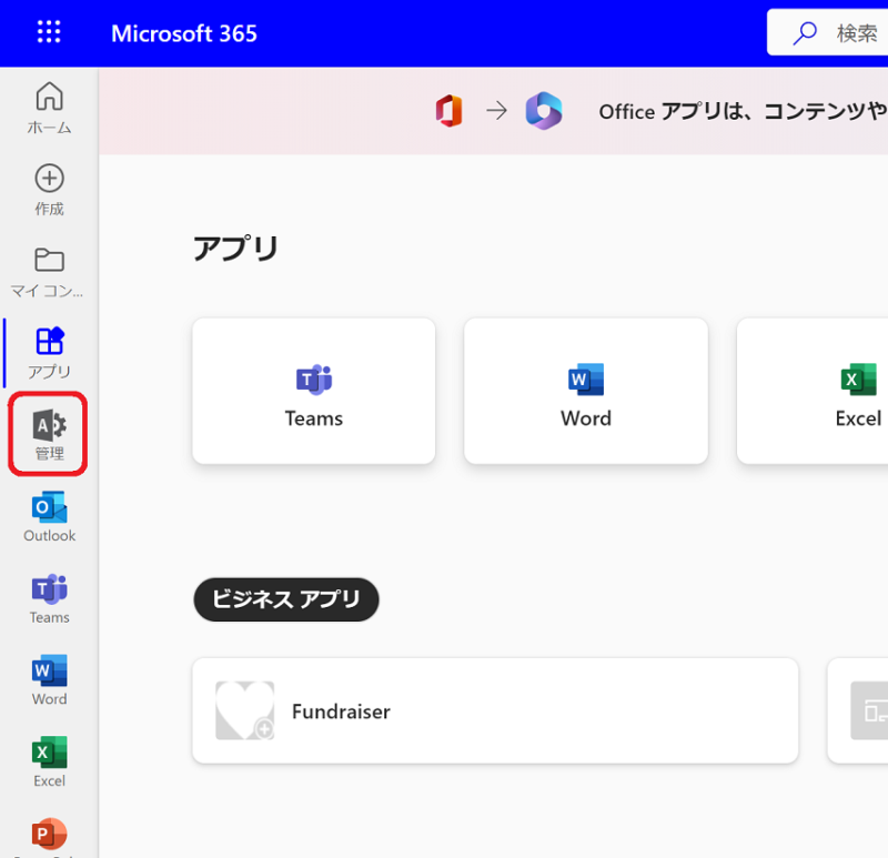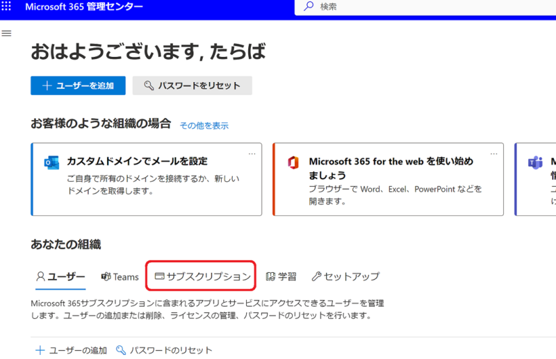 では、早速 Microsoft365の管理ページに入って操作してみます。