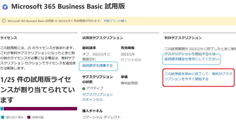赤枠の「この試用版を早めに終了して、有料サブスクリプションを今すぐ開始する」を選択しました。