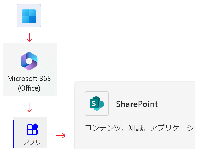 →Microsoft365 →アプリ→SharePointの順にクリック