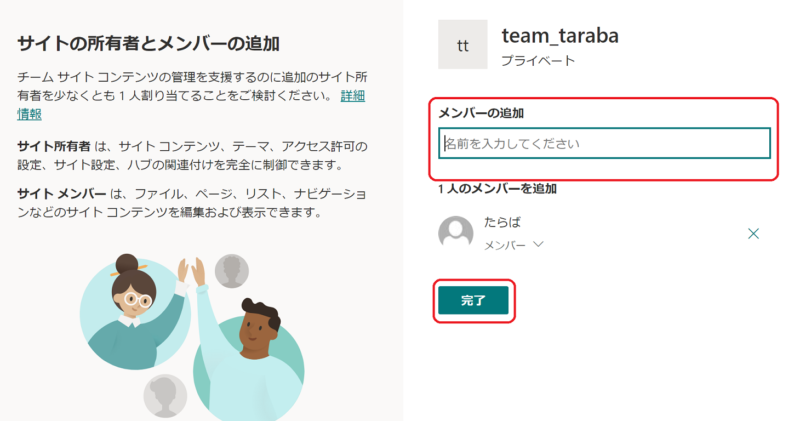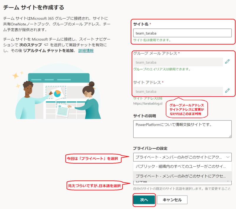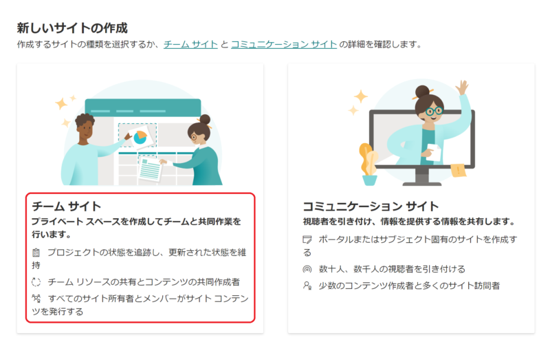 ※チームサイトを選択すると、グループも一緒に作成されます。
