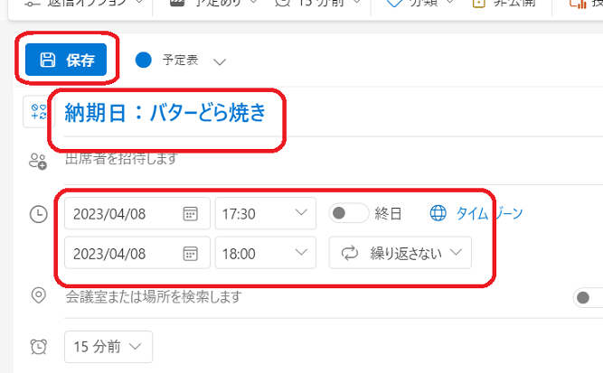 ここでは、適当なタイトル、テストできそうな日時を設定しました。
