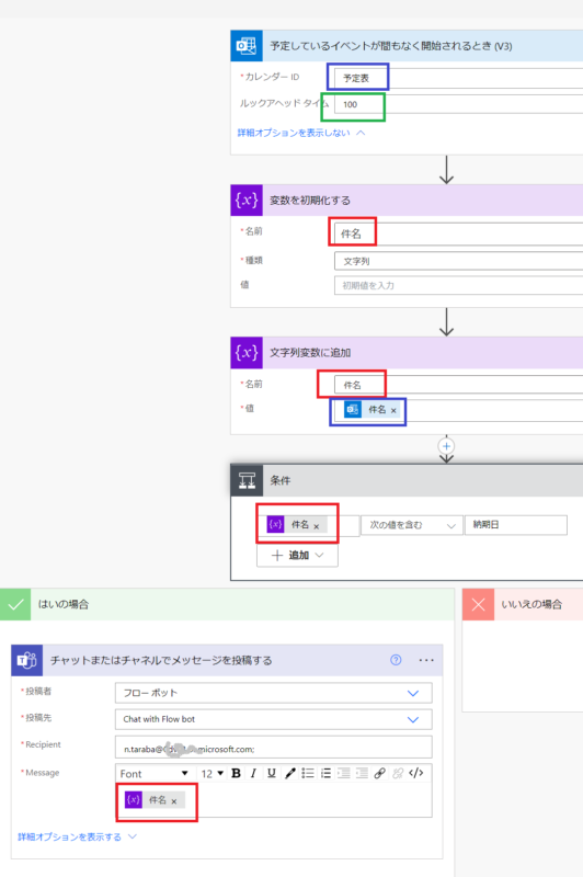 | Messeage | メッセージを作成 今回は、③の変数だけ |