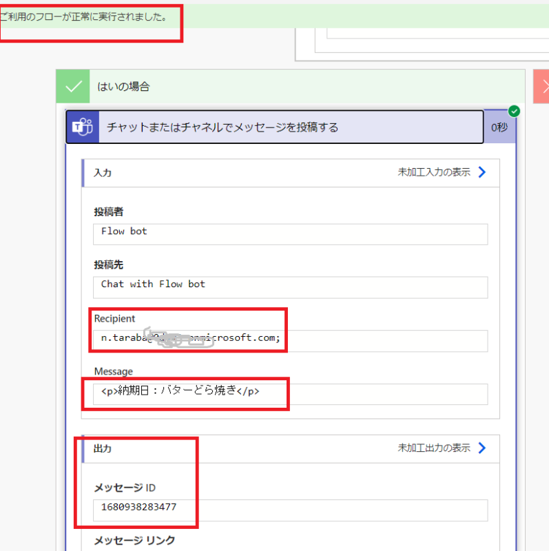 フローが正常に実行されていて、メッセージや、受信者、メッセージIDが表示されているので、チャットも飛んでいることでしょう。