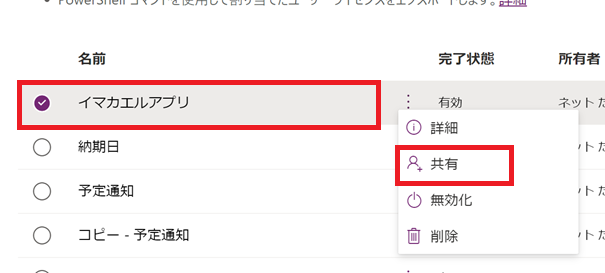 アプリを作成した後、アプリ共有する方法が、今回の作業2)の他にもあるはずと思い探してみたところ、図の場所に共有があるのを見つけた。