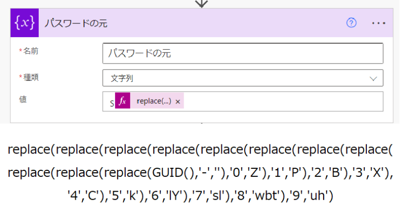 guid()で、ランダムにアルファベットを発生させようとすると数字やハイフンが邪魔なので、replaceを多用し、置き換える。置き換えは、自由で大丈夫