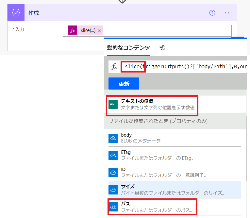 slice(triggerOutputs()?[‘body/Path’],0,outputs(‘テキストの位置の検索’)?[‘body’])